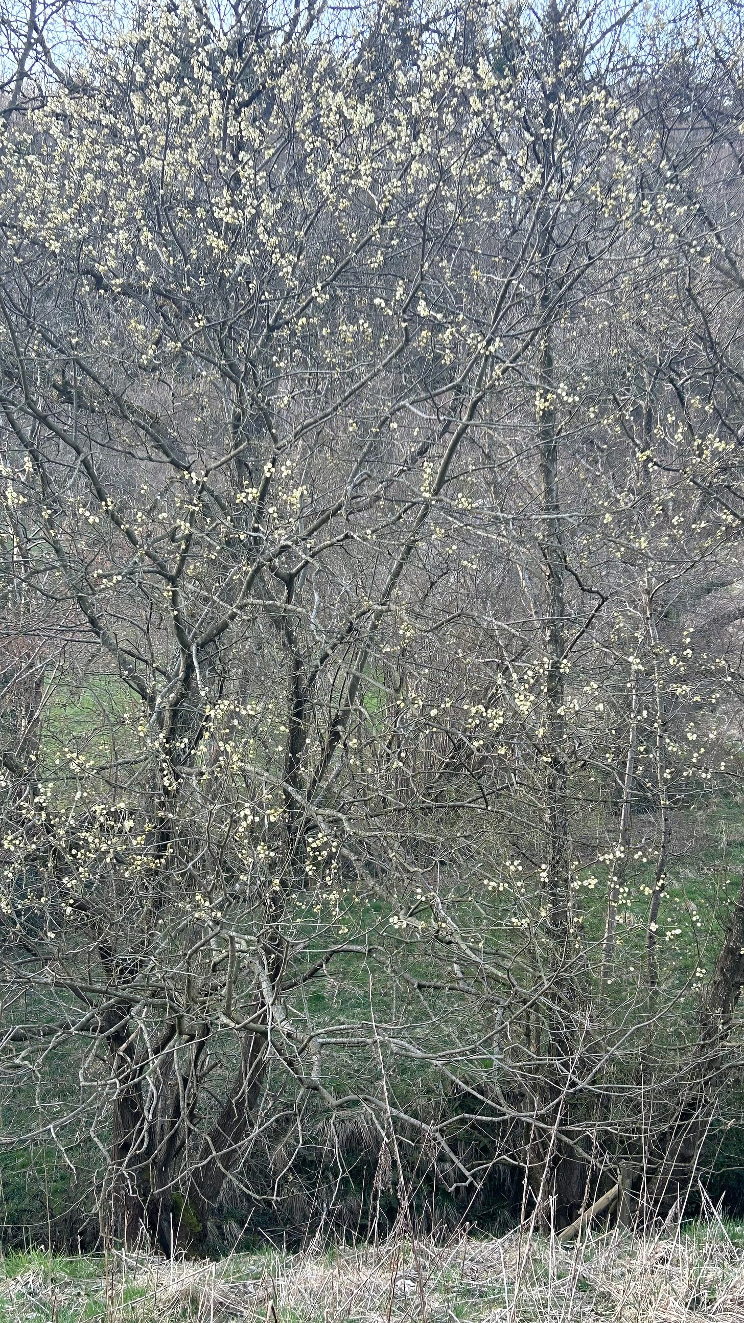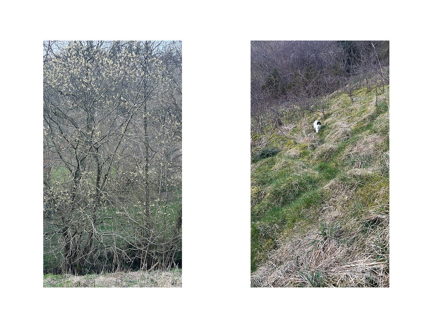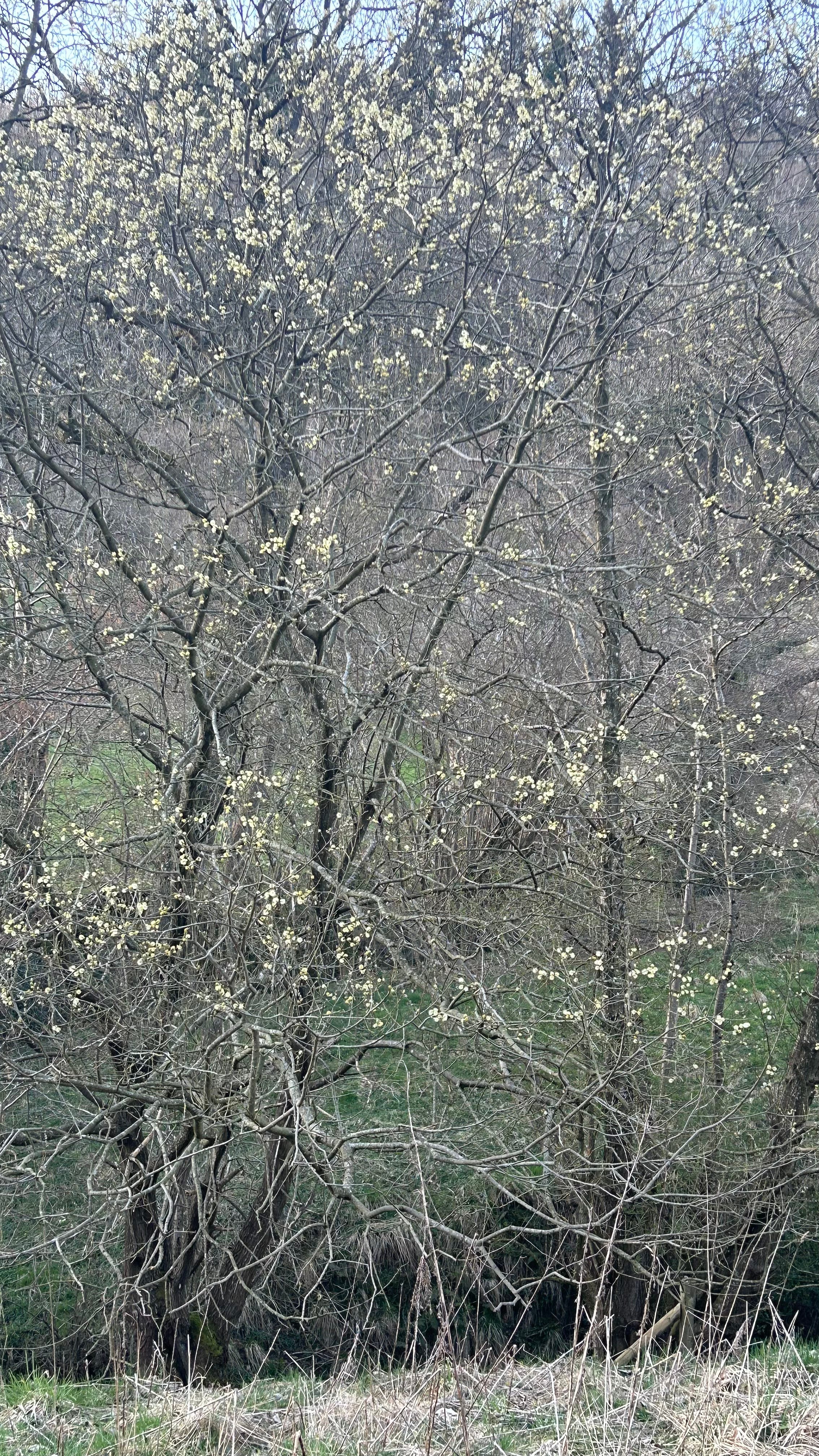Dog’s-mercury and the first bluebell tucked into the bank, and the edge of the pond lined with jelly frogspawn. The pussy-willow is out down in the gully; I visit it in the evening and hear it humming with bees.